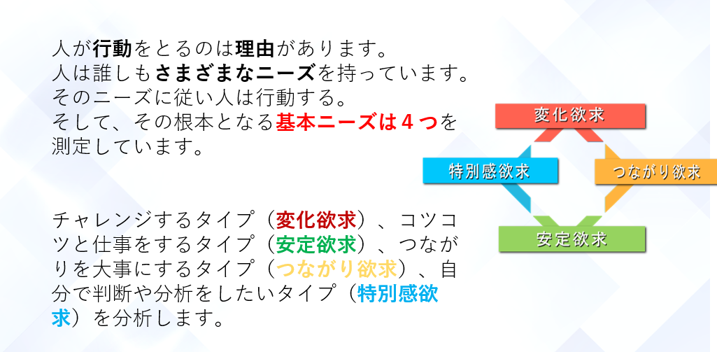 自己理解:自分の行動や感情の根源にある欲求を把握し、自己成長につなげることができます。